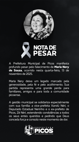 A Prefeitura Municipal de Picos decretou luto oficial de três dias pelo falecimento de Maria Nery de Souza, ocorrido nesta quinta-feira, 13 de novembro de 2025. A medida foi oficializada por meio do Decreto nº 144/2025, assinado pelo prefeito Dr. Pablo Dantas de Moura Santos.