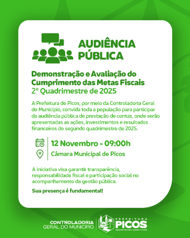 Com o objetivo de garantir a população o acesso a como os recursos públicos estão sendo utilizados e quais políticas públicas estão sendo executadas, a Prefeitura de Picos, através da Controladoria Geral do Município, irá realizar uma Audiência Pública nesta quarta-feira (12).