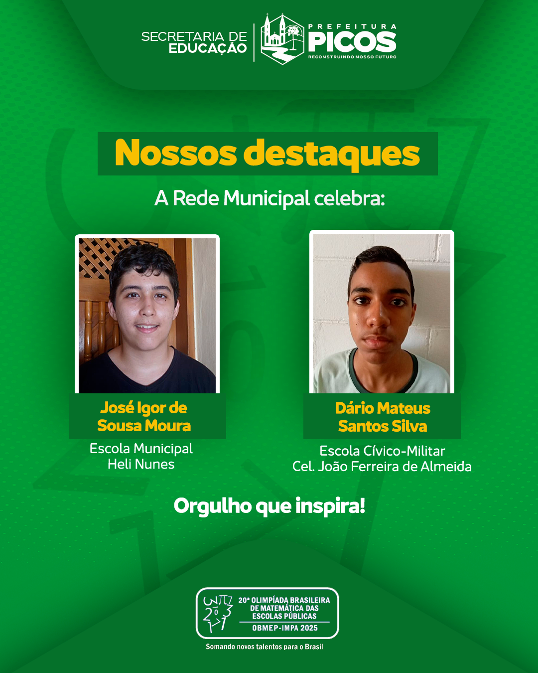 Dois alunos da Rede Municipal de Ensino de Picos foram reconhecidos nacionalmente com a Menção Honrosa na Olimpíada Brasileira de Matemática das Escolas Públicas (OBMEP): José Igor de Sousa Moura, da Escola Heli Nunes, e Dário Mateus Santos Silva, da Escola Cívico-Militar Cel. João Ferreira de Almeida.