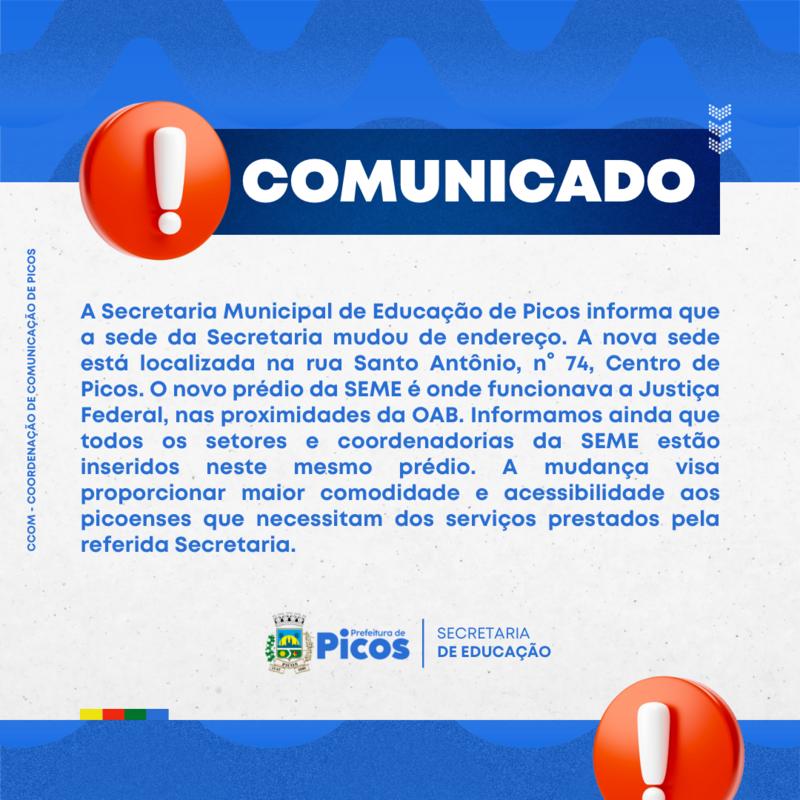 A Secretaria Municipal de Educação de Picos informa que a sede da Secretaria mudou de endereço. A nova sede está localizada na rua Santo Antônio, n° 74, Centro de Picos. O novo prédio da SEME é onde funcionava a Justiça Federal, nas proximidades da OAB. Informamos ainda que todos os setores e coordenadorias da SEME estão inseridos neste mesmo prédio. A mudança visa proporcionar maior comodidade e acessibilidade aos picoenses que necessitam dos serviços prestados pela referida Secretaria.