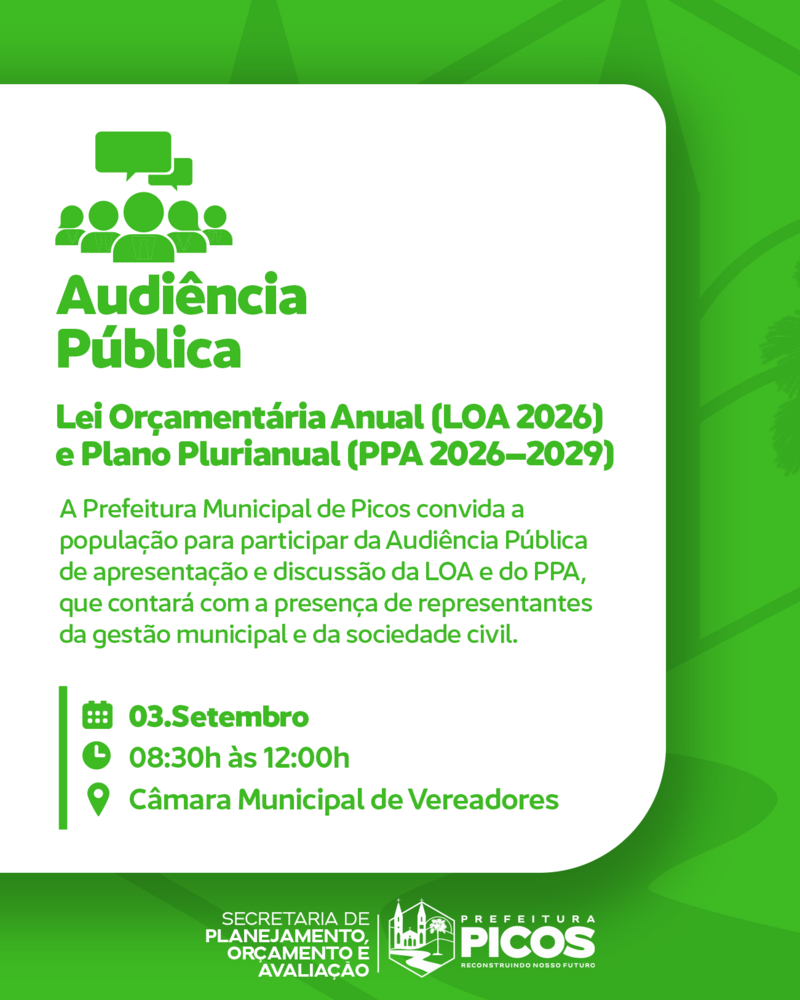 A Prefeitura de Picos, por meio da Secretaria de Planejamento, Orçamento e Avaliação, realizará na próxima terça-feira, 3 de setembro, a Audiência Pública de apresentação e discussão da Lei Orçamentária Anual (LOA 2026) e do Plano Plurianual (PPA 2026–2029). O evento será realizado das 8h30 às 12h, no plenário da Câmara Municipal de Vereadores de Picos, e contará com a presença de representantes da gestão municipal, da sociedade civil e da comunidade em geral.