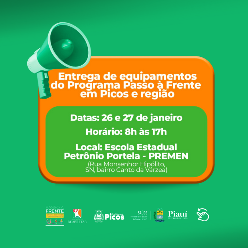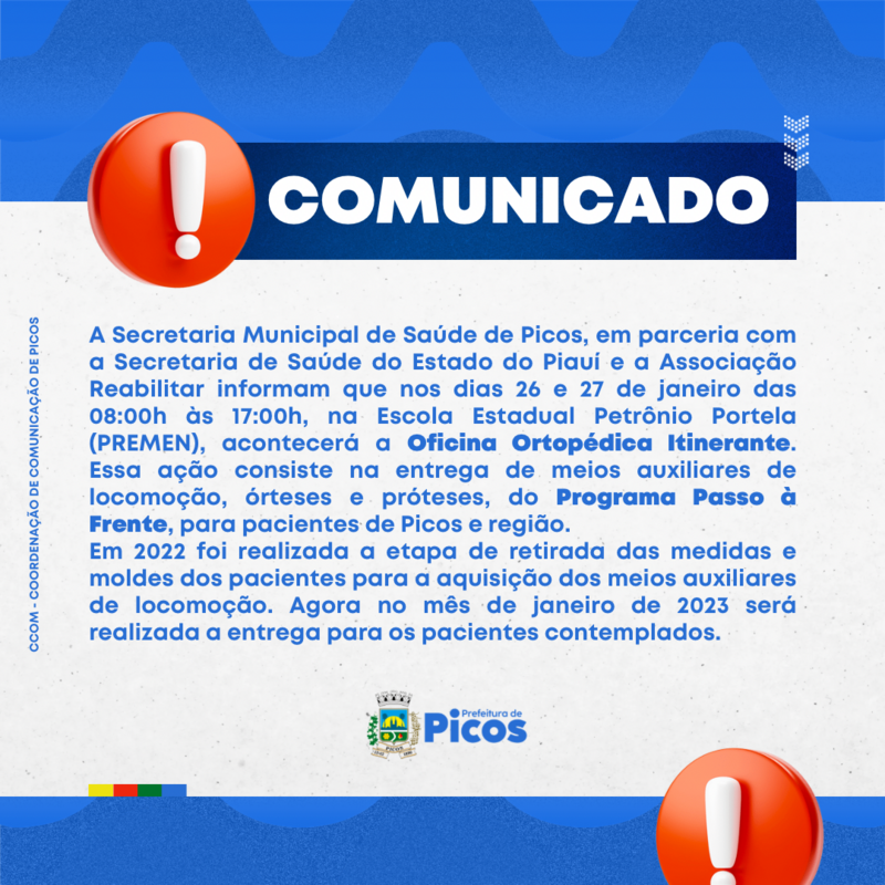 A Secretaria Municipal de Saúde de Picos, em parceria com a Secretaria de Saúde do Estado do Piauí e a Associação Reabilitar informam que nos dias 26 e 27 de janeiro das 08:00h às 17:00h, na Escola Estadual Petrônio Portela (PREMEN), acontecerá a Oficina Ortopédica Itinerante. Essa ação consiste na entrega de meios auxiliares de locomoção, órteses e próteses, do Programa Passo à Frente, para pacientes de Picos e região.