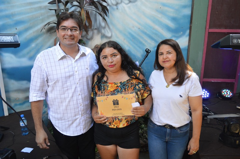 Iata Rodrigues e a Secretária de Educação Noêmia Marques ao lado da vencedora do prêmio de mil reais (Foto: Isael Pereira)