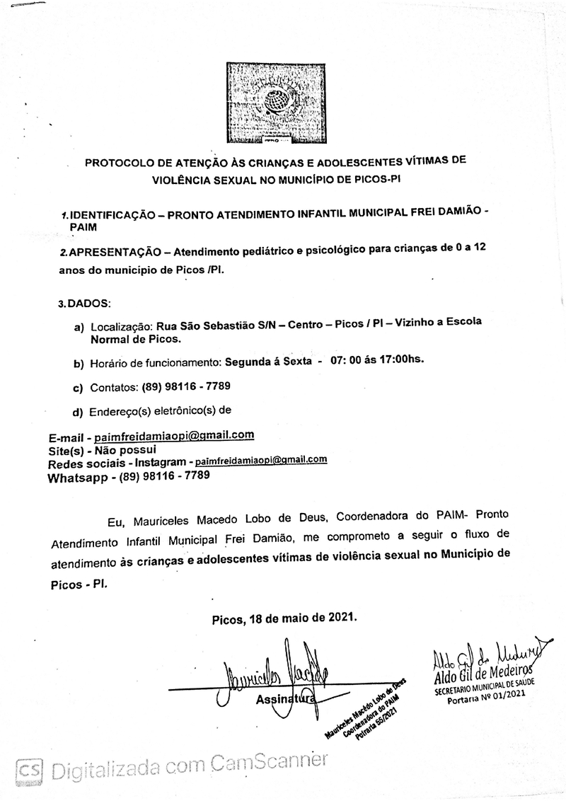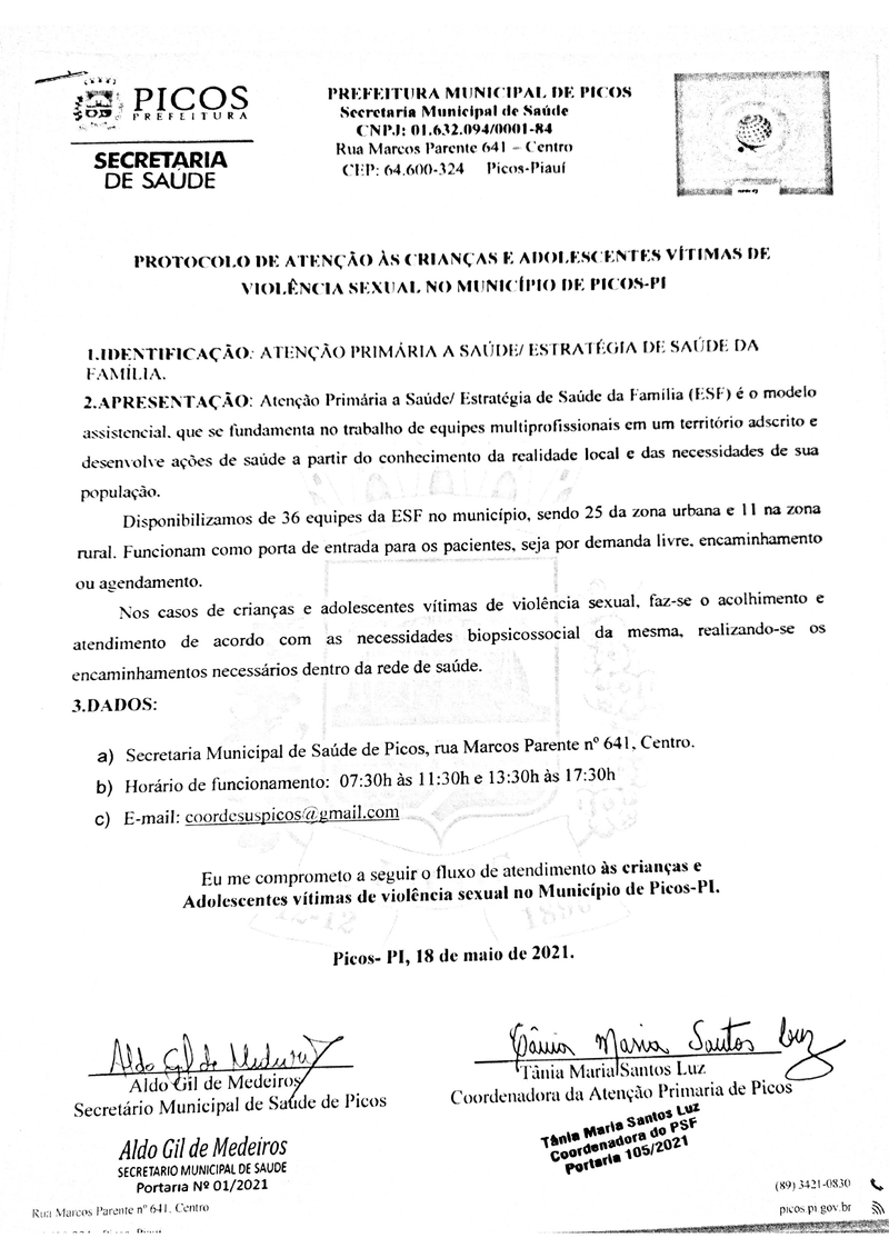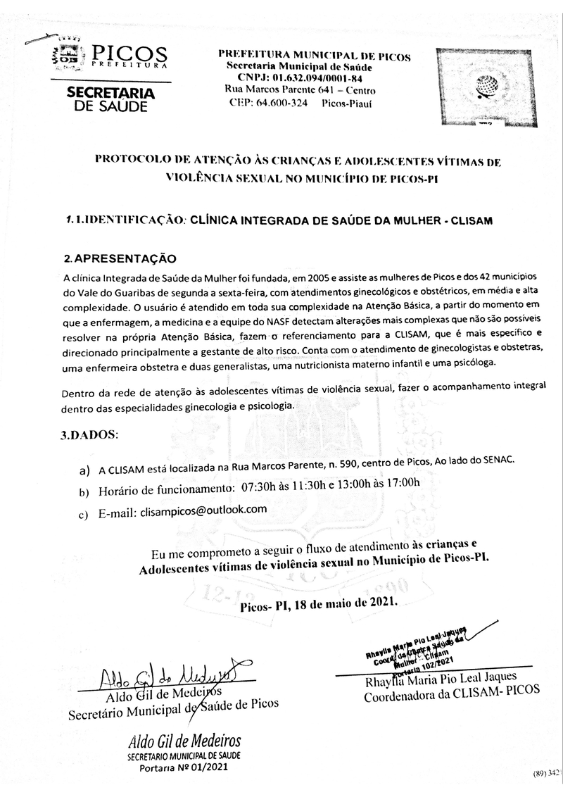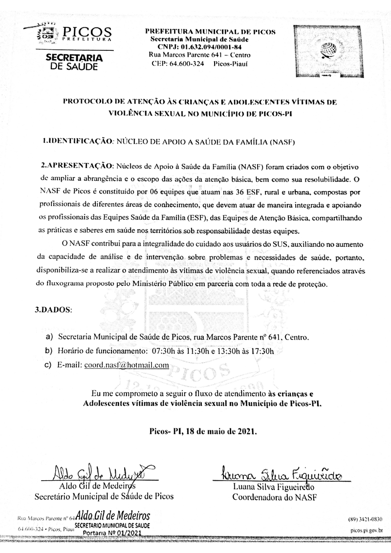Na tarde de hoje o Secretário Municipal de Saúde, Aldo Gil de Medeiros, assinou os termos de cooperação do NASF (Núcleo de Apoio à Saúde da Família), CAPS (Centro de Atendimento Psicossocial), PAIM (Pronto Atendimento Infantil Municipal) e CLISAM (Clínica de Saúde da Mulher), para criar uma rede de atendimento e acompanhamento de menores que sofreram abusos sexuais e/ou violência doméstica.