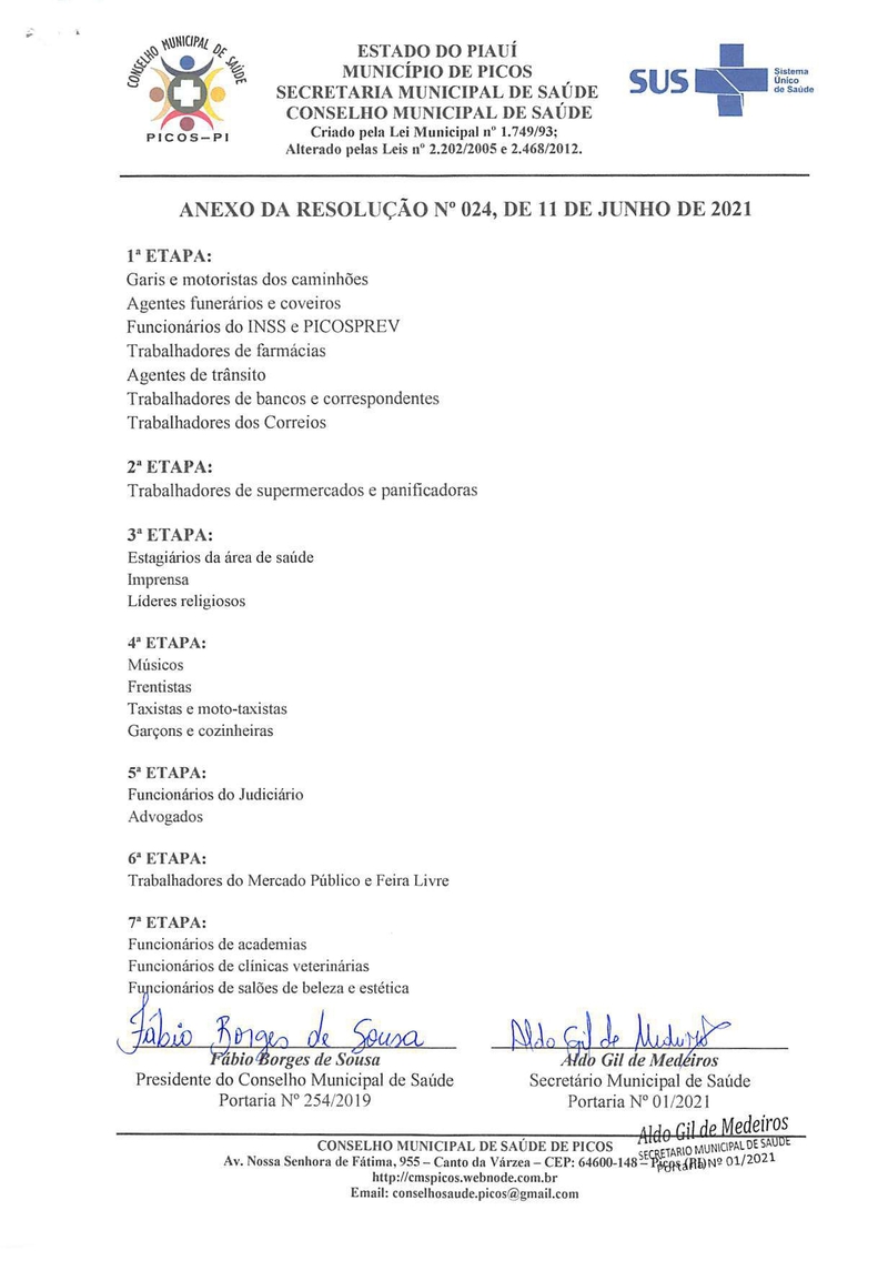 O Secretário Municipal de Saúde de Picos, Aldo Gil de Medeiros, homologou a Lista de Prioridades de Imunização de Picos contra a covid-19, extraída da Resolução n° 023/2021, nos termos do Art. 15 do Regimento Interno do Conselho Municipal de Saúde de Picos, relativa aos 20% sobre o total de doses repassadas ao município não contempladas no PNI – Plano Nacional de Imunização.